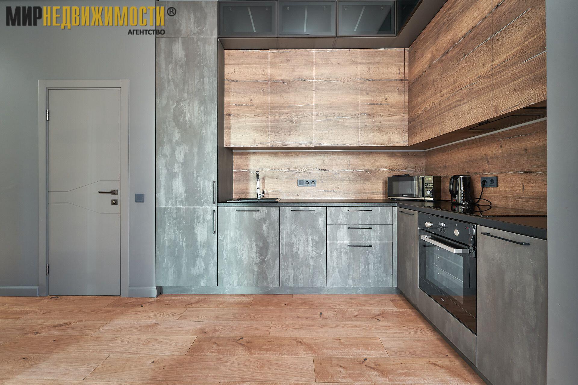 Кухня оборудована всей необходимой встроенной техникой: большая посудомоечная машина, холодильник, варочная панель, духовой шкаф, микроволновая печь.