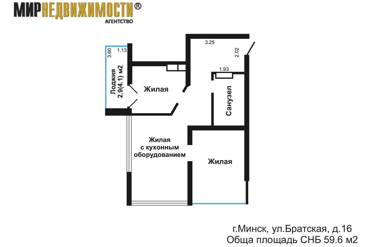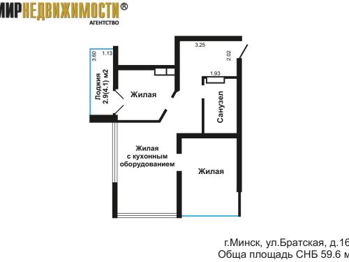 Общая площадь по СНБ – 59.6 м2, жилая площадь 48.6 м2. Высота потолков 3 м.