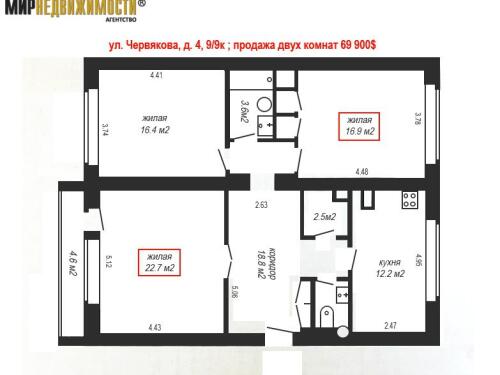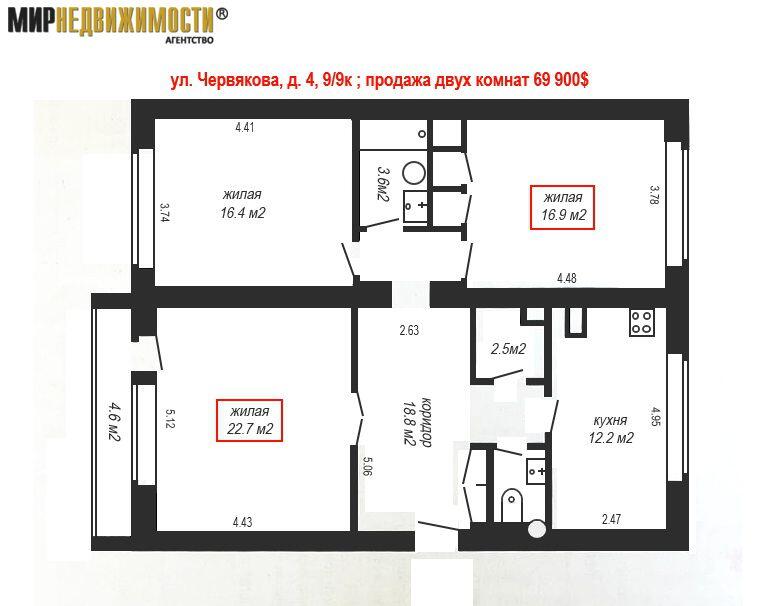 Продаются две просторные квадратные комнаты 16.9 и 22.7 кв.м. (749/1000 доли) в трёхкомнатной квартире общей площадью по СНБ 98.2 кв.м. с шикарным видом из окон в центре Минска! Кирпичный дом 1971 г.п. находится в зелёной зоне на границе Переспинского сквера и в 300-х метрах от набережной реки Свислочь с местами отдыха и прогулок.