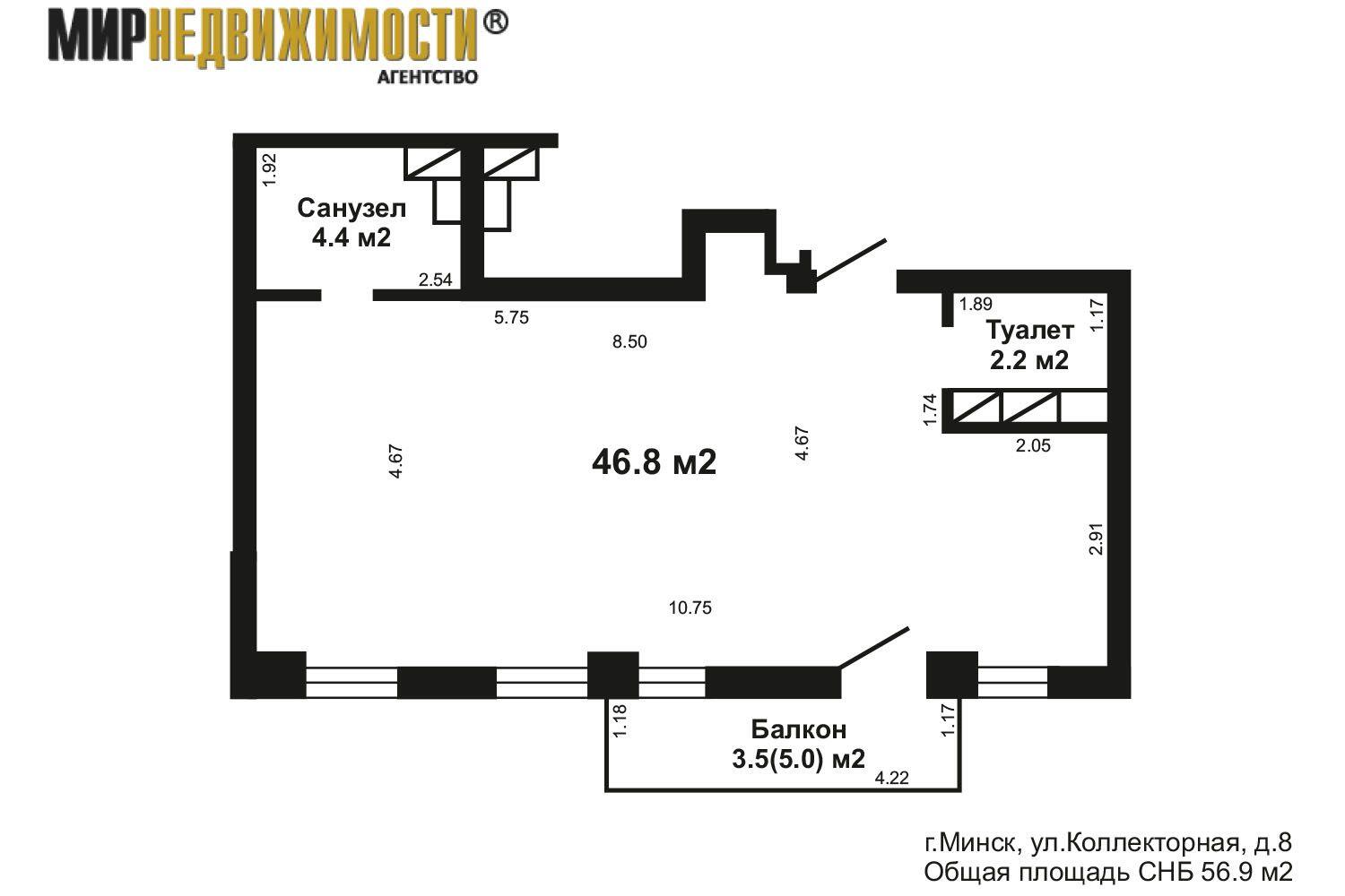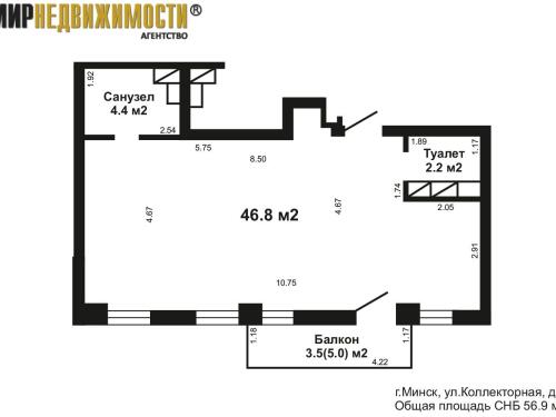 Общая площадь 53,4 кв.м., площадь по СНБ 56,9 кв.м., 2 санузла, балкон застеклен. h=2,65.