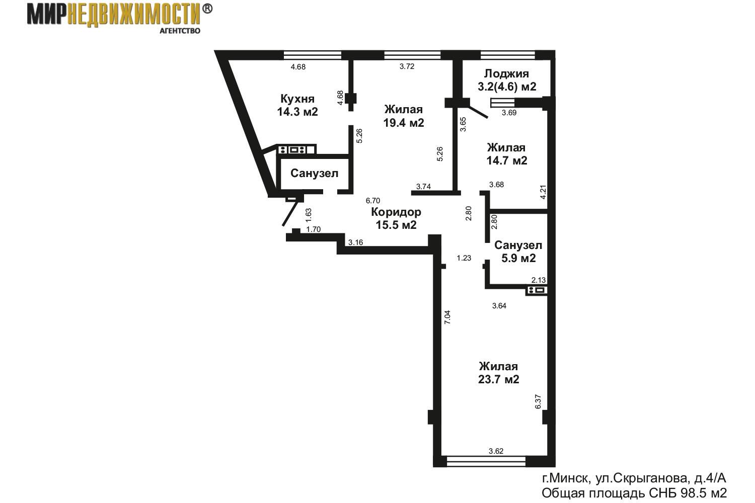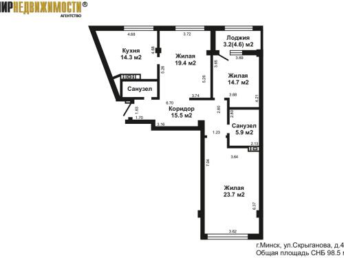 Общая площадь СНБ - 98.5 м2, общая площадь - 95.3 м2, жилая - 57.8 м2, кухня - 14.3 м2