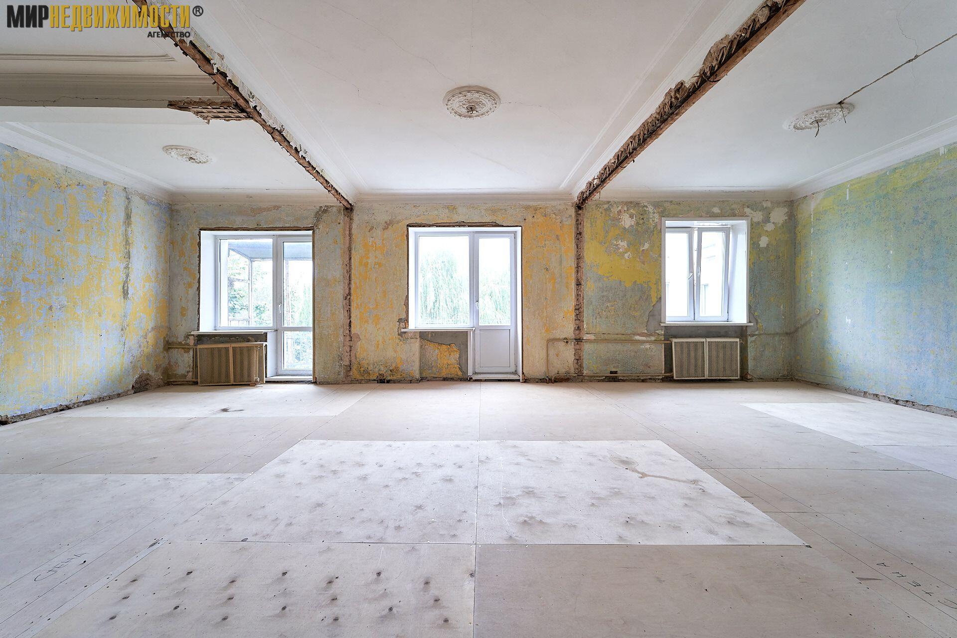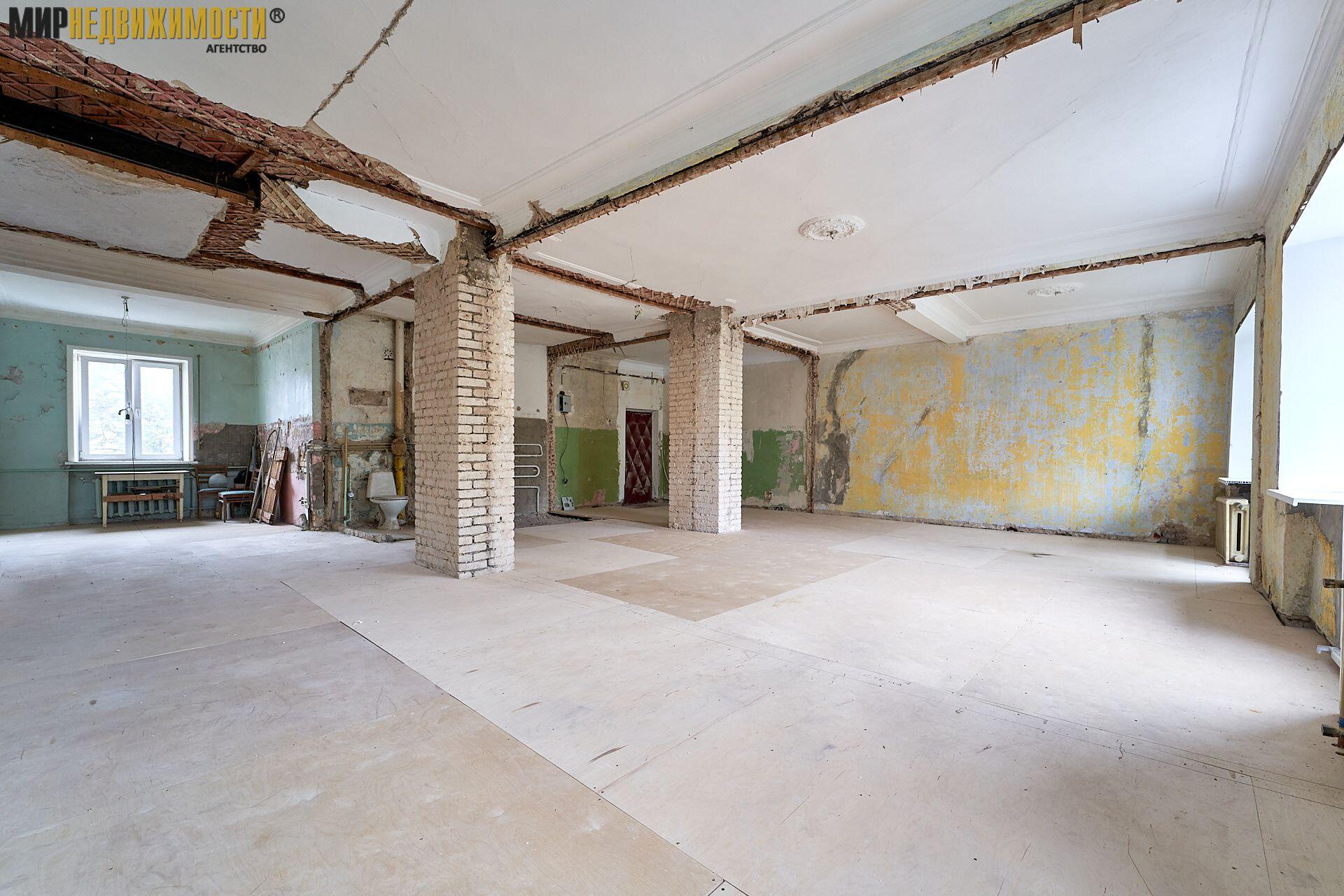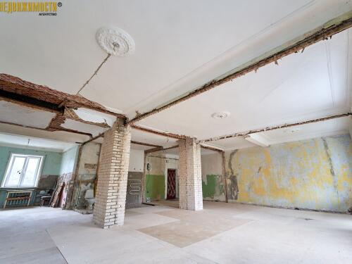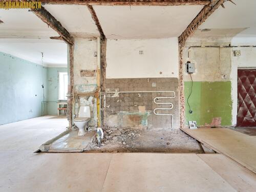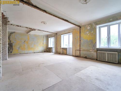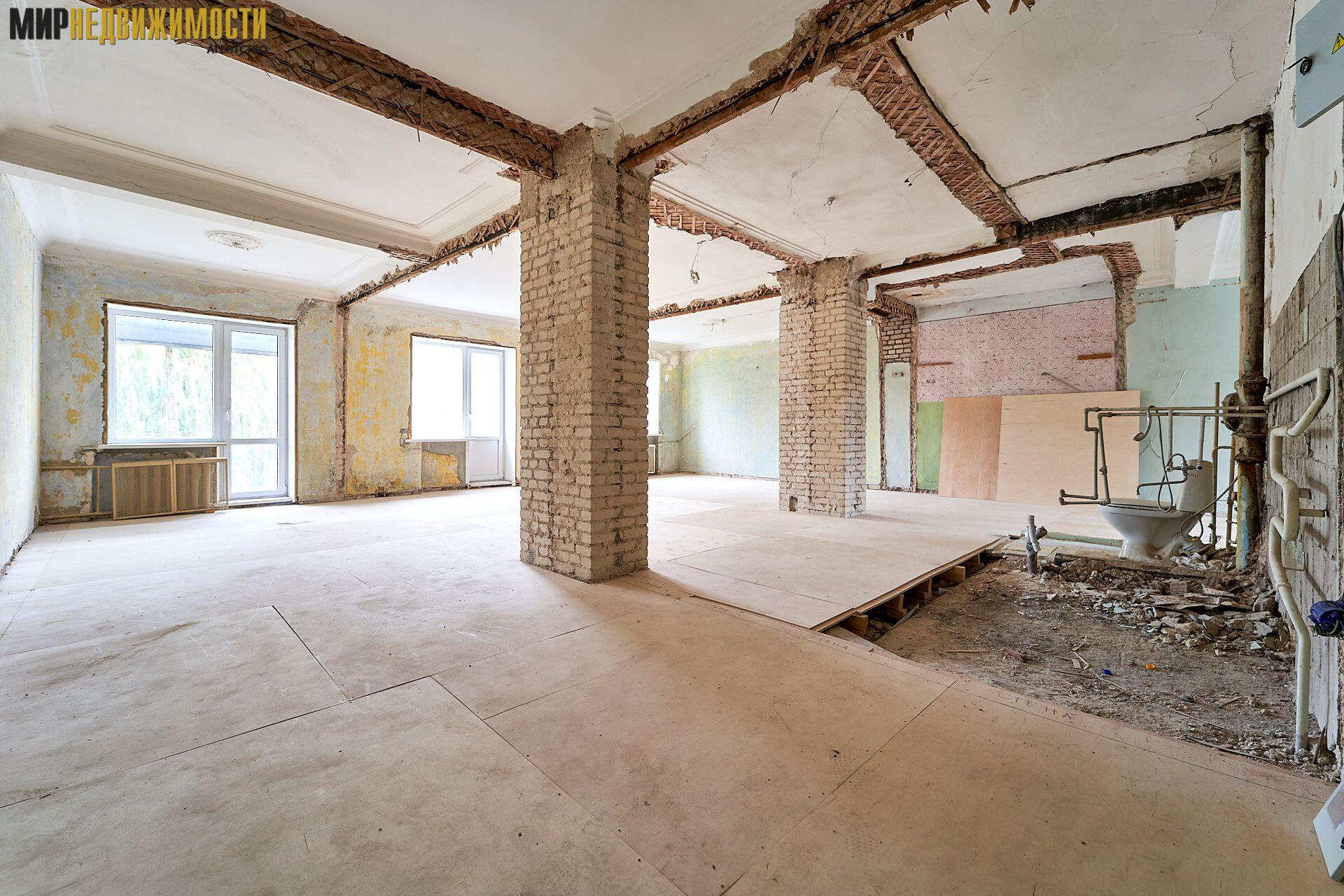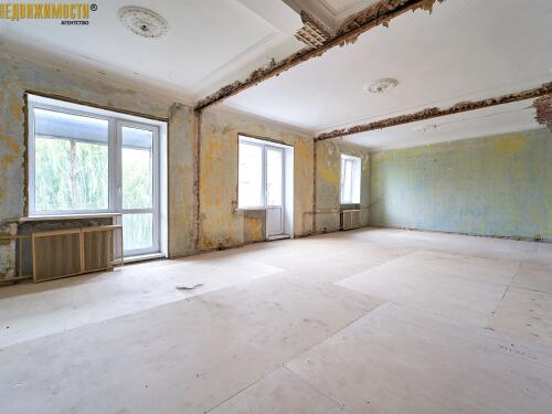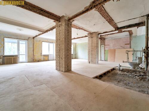 В квартире произведен демонтаж всех внутренних стен, остались только несущие колоны, что значительно уже экономит время и деньги для реализации ремонта. Двор дома утопает в зелени и высоких ивах.
