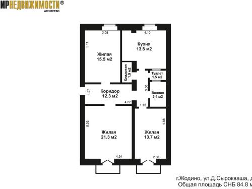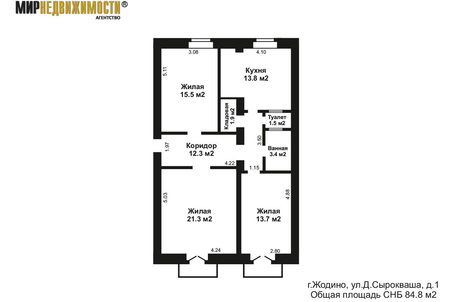Общая площадь по СНБ – 84,8 кв.м. Жилая – 50,7 кв.м. Высота потолков – 2,9 м, плиты перекрытия железобетонные. Планировка квартиры: 3 просторные изолированные комнаты – 15,5 и 13,7 и 21,3 кв.м. Кухня – 13,8 кв.м. Раздельный санузел. Большие окна. Подвал. Входная дверь – металлическая. Дом расположен напротив большого Парка культуры и отдыха, недалеко от центра города, вблизи всей инфраструктуры: детский сад № 4, средняя школа № 2, средняя школа № 4. Продуктовые магазины: «Соседи», «Копеечка», «Грошик», бассейн «Асилак», стадион «Торпедо». Отделение банка и почты. Аптеки и поликлиника.