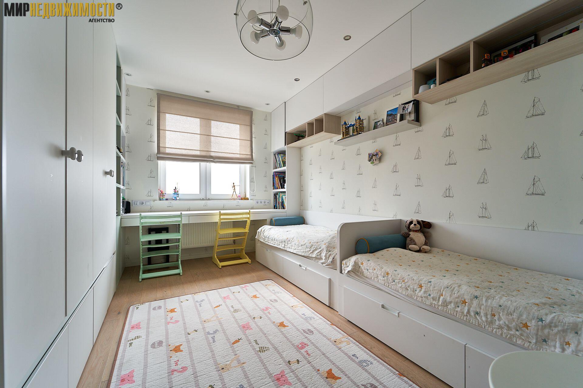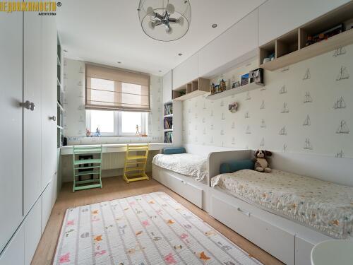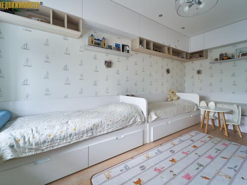 - Детская комната для троих детей спроектирована и продумана до мелочей с большим количеством мест для хранения.